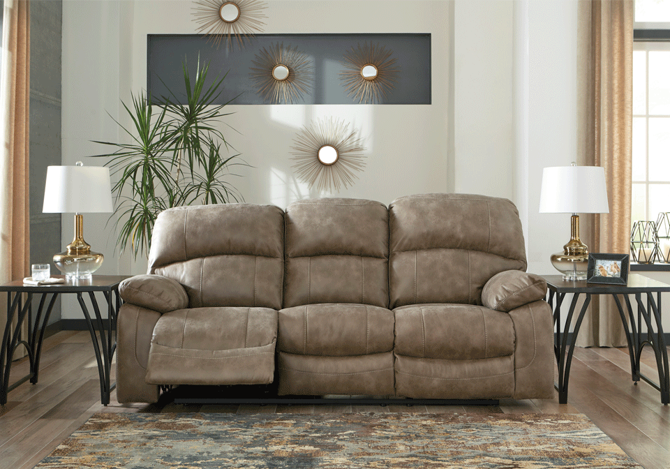 There is power in beauty with the Dunwell power reclining sofa. Handsome crackle effect in the upholstery give the appearance of supple leather but this recliner is all about the warmth of fabric. Contrast jumbo stitching adds a stylish touch. Double stuffed armrests cuff your body in comfort. Adjust your head and recline back with one easy touch.