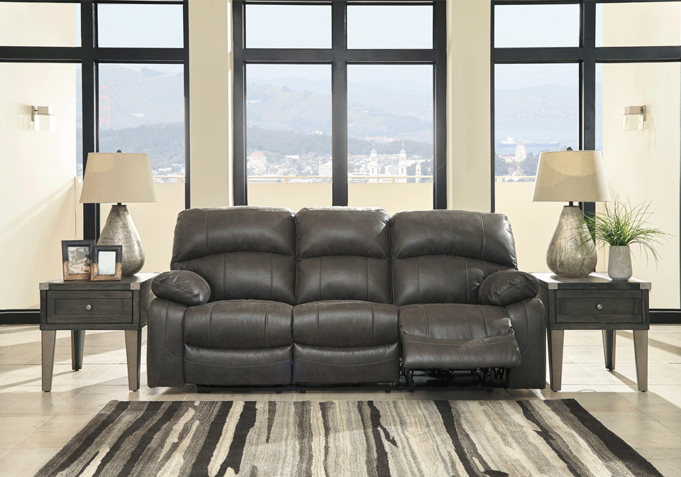 There is power in beauty with the Dunwell power reclining sofa. Handsome crackle effect in the upholstery give the appearance of supple leather but this recliner is all about the warmth of fabric. Contrast jumbo stitching adds a stylish touch. Double stuffed armrests cuff your body in comfort. Adjust your head and recline back with one easy touch.