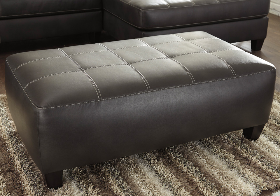 The word “plain” is not in the Nokomis ottoman’s vocabulary. Charcoal color faux leather is inspired by contemporary euro leather with an embossed natural grain effect and matte finish. Light gray stitching adds contrast. More than generous in scale with tufting on the top