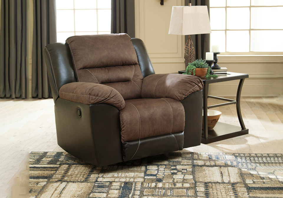 Every day is a good day with this rocker recliner around. Take a load off and forget your worries as you ease back into the luxurious feel of suede-like fabric. Faux leather covers the outside parts for an elevated look. Need more comfort and support for your body? Cue the deep seating and tall back. Contrast jumbo stitching adds an element of style to the cushions.