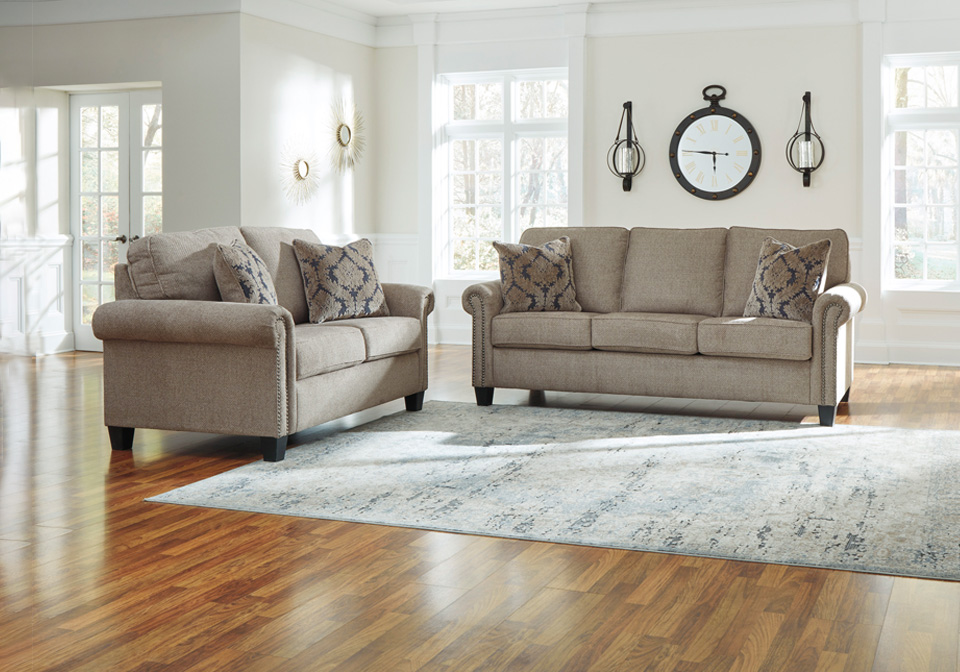 this high-style sofa set in a richly woven neutral fabric is sure to stand the test of time. Chenille-feel fabric offers a sumptuousness that’ll have you hooked. Designer elements include black nickel-tone nailhead trim punctuating the roll arms and a pair of velvety jacquard pattern pillows that really kick it up a notch.