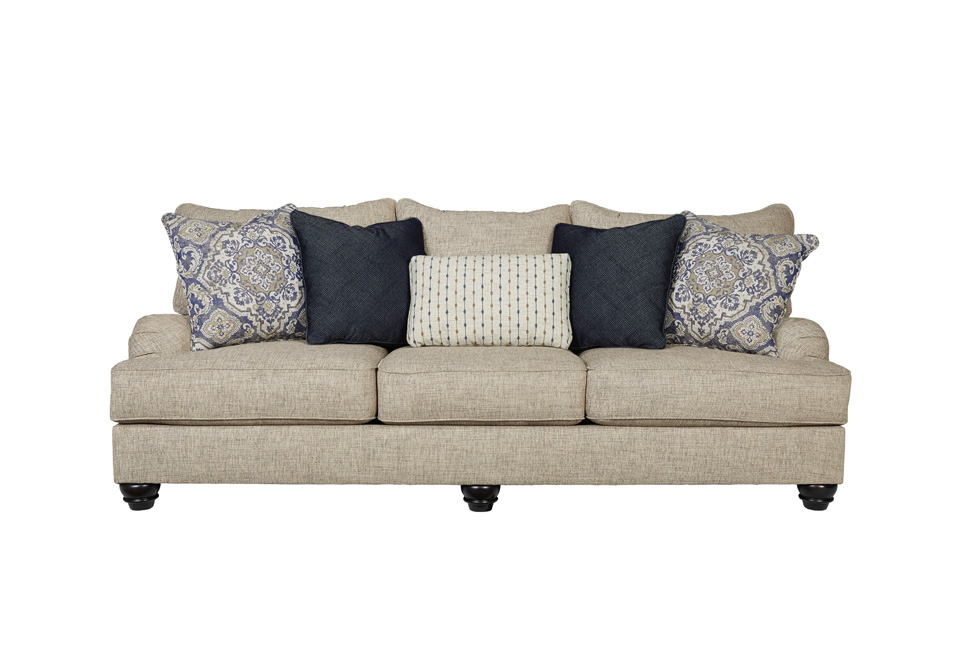 but the aesthetic is anything but stuffy. Charles of London arms and turned bun feet give this sofa a sense of grace and elegance that’s never out of fashion. Chenille-feel upholstery with basket weave texture is made all the more enticing with layered accent pillows with mix-and-match appeal. Whether your style is European influenced