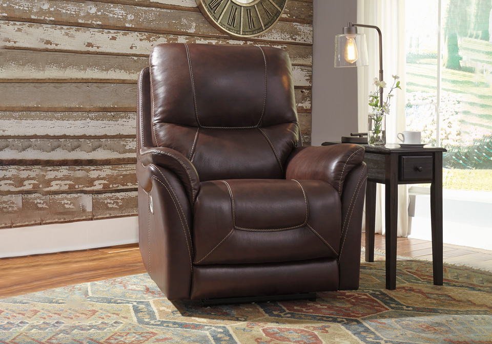 Does it feel like your body has been pulling you to go somewhere lately? We know where to—this remarkable power recliner. Flared arms invite you to sit down in the ample seat. Supple leather on the seating area and extended ottoman cradles you in comfort. Quality continues with faux leather on the back and sides. Just one push of a button sends you on your way to reclining and relaxation. Ready for more? The Easy View™ power adjustable headrest positions your head for comfort and power lumbar keeps your back well-supported for the total sitting experience.