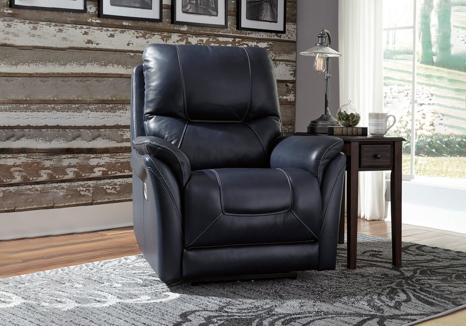 Does it feel like your body has been pulling you to go somewhere lately? We know where to—this remarkable power recliner. Flared arms invite you to sit down in the ample seat. Supple leather on the seating area and extended ottoman cradles you in comfort. Quality continues with faux leather on the back and sides. Just one push of a button sends you on your way to reclining and relaxation. Ready for more? The Easy View™ power adjustable headrest helps position your head for comfort and the power lumbar keeps your back well-supported for total sitting experience.