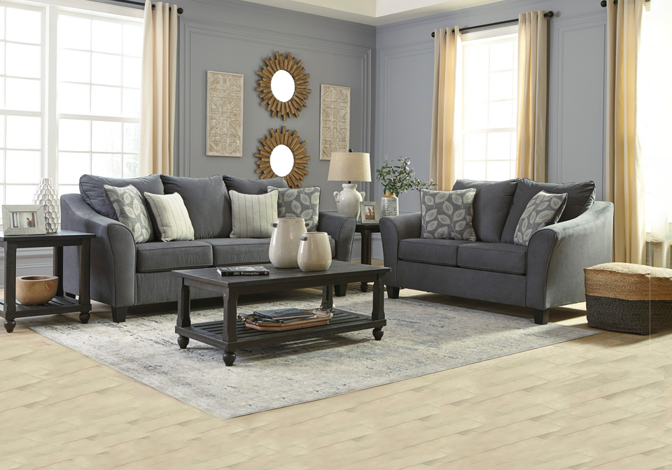 This sofa set is your home’s fashion wonder. Velvet microfiber fabric is on trend and elevates your space with luxurious texture. Plush cushions make it a pleasure to sit. Casual contemporary flare arms invigorate this style with a comfortable place to rest your arm. Accented with linen-look stripe and abstract vine pattern throw pillows to lighten the look.