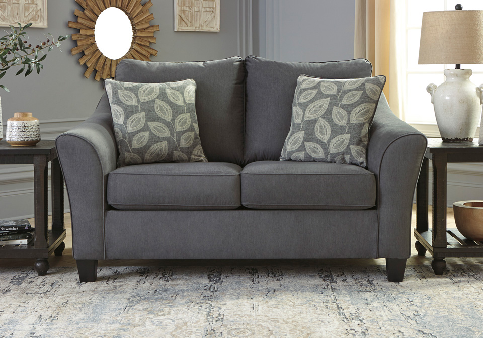 This loveseat is your home’s fashion wonder. Velvet microfiber fabric is on trend and elevates your space with luxurious texture. Plush cushions make it a pleasure to sit. Casual contemporary flare arms invigorate this style with a comfortable place to rest your arm. Accented with linen-look stripe and abstract vine pattern throw pillows to lighten the look.