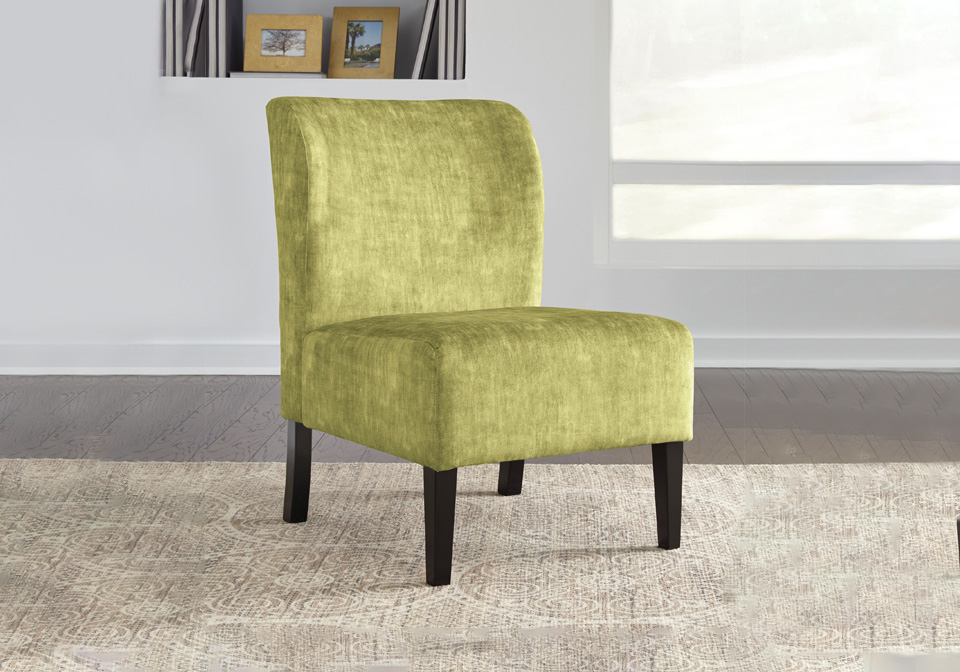 This fashion-forward accent chair adds a cool vibe to your home. Armless design is perfect for small spaces that need a spark of color. Bright green hue with distressed finish saturates the ultra soft fabric. Supportive cushions bring in an element of comfort.