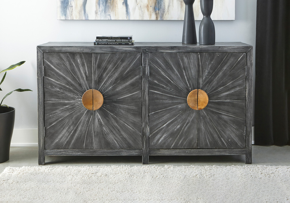 This accent cabinet flaunts style unleashed. Gorgeous wood grain permeates from the center brown door pulls for a fashion-forward look that draws you in. Antiqued black finish creates attractive contrast in your home. Stow away necessities on the interior shelves to keep your room clutter-free.