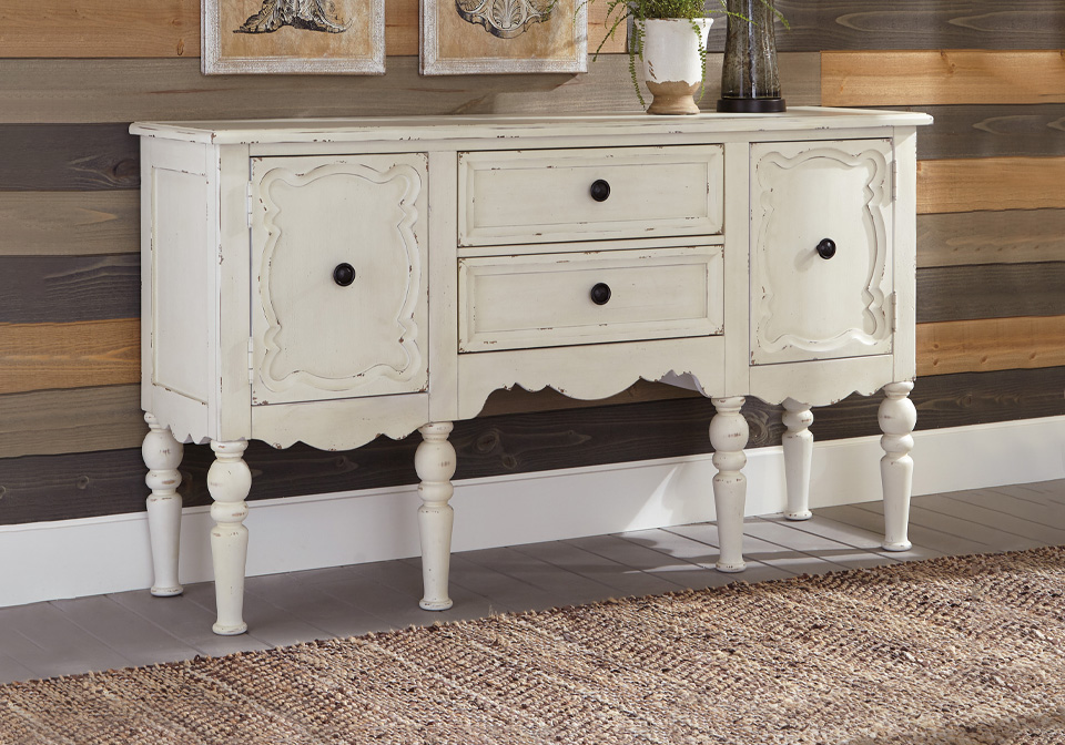 Sweet and simple charm. This accent cabinet is adorned with scalloped detailing and turned legs. Doors and drawers are framed in infallible elegance. Antiqued black metal knobs infuse high contrast into the timeworn white finish. Such a feminine touch with a functional purpose.