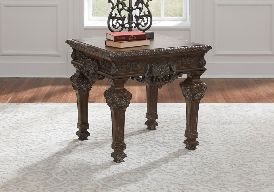 When only the best will do. This end table’s uniquely luxurious interpretation of traditional style says it all. Beautifully flowing elements weave their magic. Square design with richly crafted edges and contrasting veneer border reflect Old World influences. Exquisitely crafted and treated to a multi-hued finish