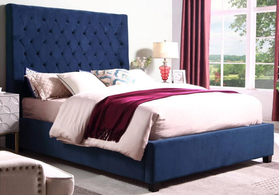 Crown_Mark_Aster_Navy Published November 21, 2018 at 960 × 672 in Crown_Mark_Aster_Navy The Aster upholstered queen bed in navy features a slightly-curved headboard accented with elegant details such as luxurious velvet upholstery ← Previous Next →