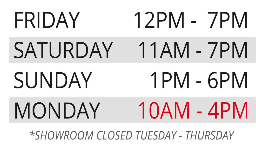 • FRI 12pm - 7pm | SAT 11am - 7pm | SUN 1pm - 6pm | MON 12pm - 6pm