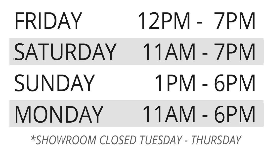 • FRI 12pm - 7pm | SAT 11am - 7pm | SUN 1pm - 6pm | MON 12pm - 6pm