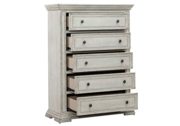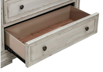 Made with Rubberwood Solids w/ Wood Products, finished in a Whitestone w/ Heavy Distressing. Full Extension Metal Side Drawer Guides (45mm). French & English Dovetail Construction. Bottom Case Dust Proofing. Fully Stained Interior Drawers. Premium Felt Lined Top Drawers. Features Charging Station. Antique Pewter Knob Hardware.