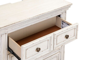 Made with Rubberwood Solids w/ Wood Products, finished in a Whitestone w/ Heavy Distressing. Full Extension Metal Side Drawer Guides (45mm). French & English Dovetail Construction. Premium Felt Lined Top Drawer. Cedar Lined Bottom Drawer. Wood Framed Drawers. Has 3 Drawers. Features Charging Station w/ 2 Outlets & USB Ports. Antique Pewter Knob Hardware.