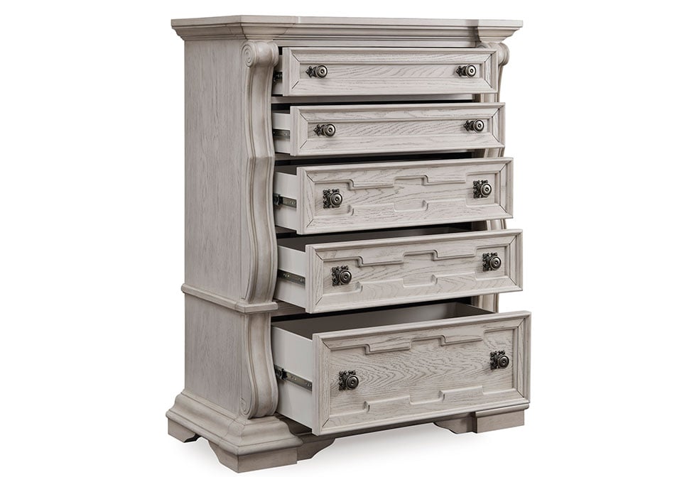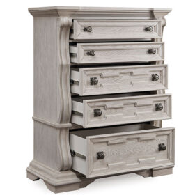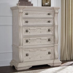 Inspired by the grandeur and grace of European traditional style, this opulent Series is nothing short of stunning. Its large-scale decorative scrolled pilasters, along with an ash swirl border and walnut inlay crowning the top, are sure to make a sophisticated statement in your restful retreat. A timeless antiqued white coloration and bronze-tone drawer pulls on case pieces lend an air of subtle elegance to this sumptuous piece.