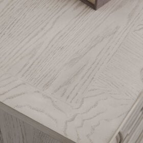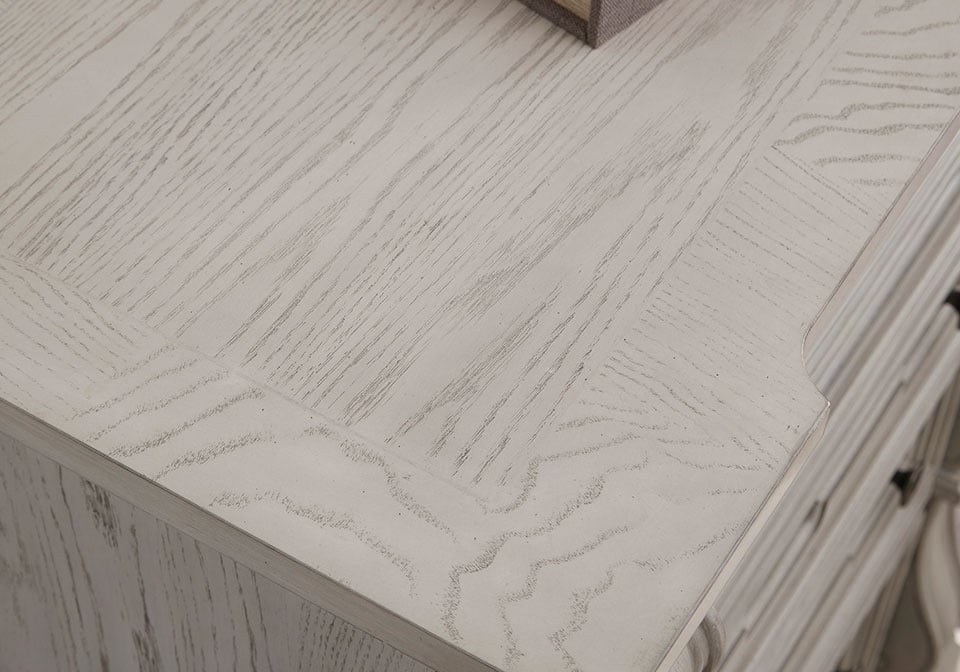 Made with hardwood solids, oak and ash swirl veneers, MDF substrates and cast resin components. Antiqued white finish. Hardware with antiqued bronze-tone finish. Case pieces having drawers with fully finished interiors, English dovetail construction and heavy-duty ball-bearing side glides (top drawers felt lined).