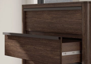 Casual contemporary styling with a decidedly modern vibe. This Series is warm and inviting with a rich dark brown finish, adorning your restful retreat with on-trend elegance. Full-length metal pulls in a matte black finish add a subtly cool touch to spacious storage drawers. What a simply stunning way to achieve the bedroom of your dreams.