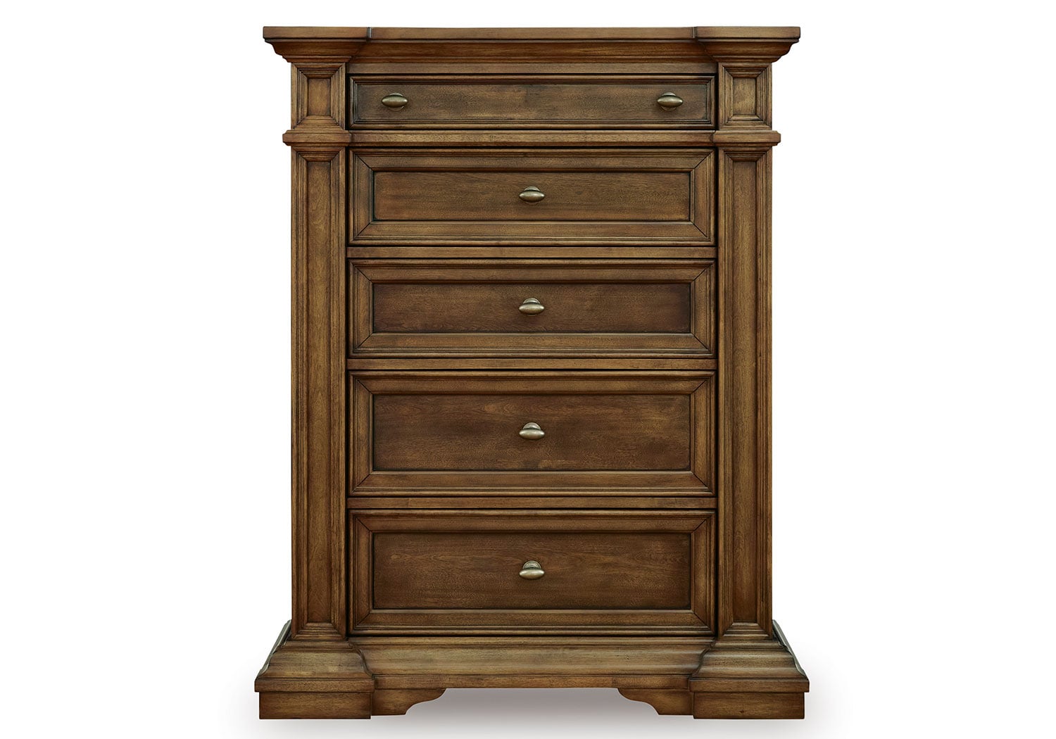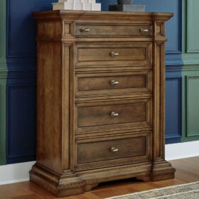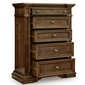 Made with hardwood solids, birch veneer and MDF substrate. Multi-step brown finish using stains and glaze with hand-rubbed details. Large metal oval knobs with antiqued brass-tone finish. Smooth-gliding drawers with fully finished interiors, dovetail construction and heavy-duty ball-bearing side glides. Top drawers felt lined. Night Stand with AC outlet, USB-A, & USB-C charging ports.