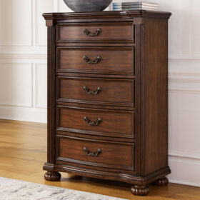 Take inspiration from the traditional luxury of this chest of drawers. Classic with a rich cherry brown finish, its stately presence graces your room with an air of opulence. Your taste for exquisite details is satisfied with decorative drawer pulls and chic bun feet. With five drawers acting as elegant hosts for clothes and other essentials, your restful retreat has never been so refined.