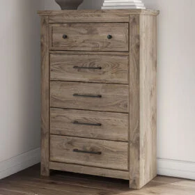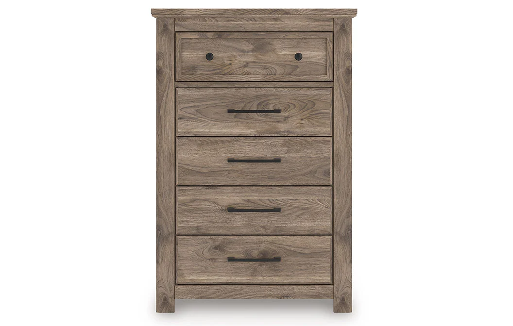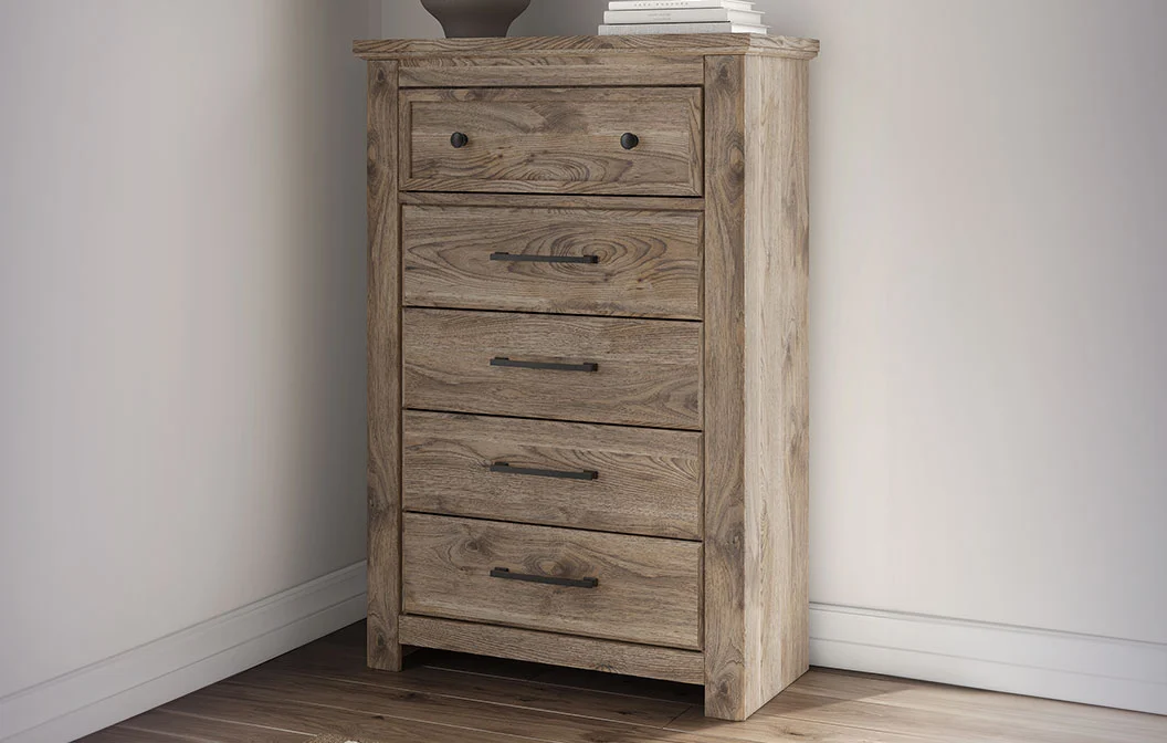 Made with engineered wood (MDF/particleboard/plywood) and decorative laminate for the right balance of affordability and durability. Deep brown finish over replicated hickory grain with authentic touch. Decorative laminate replicates natural or man-made material surfaces with consistent color, pattern and texture. Hardware with dark bronze-tone finish. 5 smooth-gliding drawers. Drawer interiors are lined with a faux linen laminate for a clean, finished look. Drawers extend out to accommodate maximum access to drawer interior while maintaining safety.