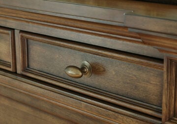 Made with hardwood solids, birch veneer and MDF substrate. Multi-step brown finish using stains and glaze with hand-rubbed details. Large metal oval knobs with antiqued brass-tone finish. Smooth-gliding drawers with fully finished interiors, dovetail construction and heavy-duty ball-bearing side glides. Top drawers felt lined. Night Stand with AC outlet, USB-A, & USB-C charging ports.