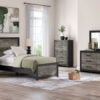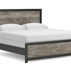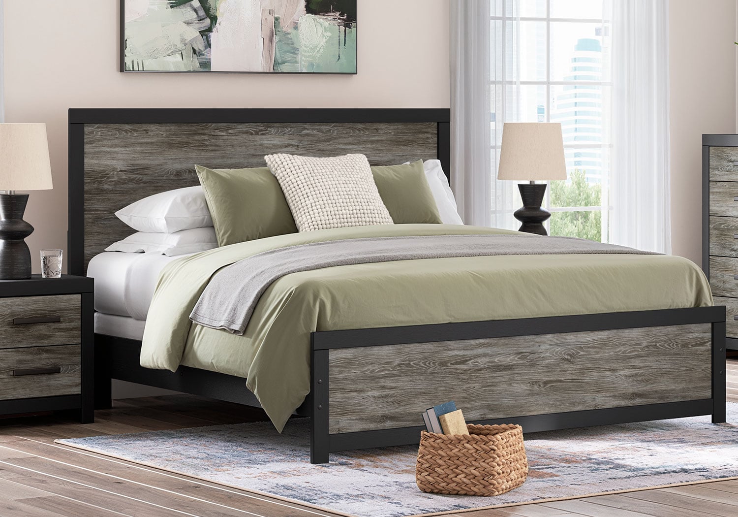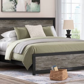 Made with engineered wood (MDF/particleboard/plywood) and decorative laminate for the right balance of affordability and durability. Two-tone finish (warm gray finish and matte black finish with replicated oak grain). Decorative laminate replicates natural or man-made material surfaces with consistent color, pattern and texture. Foundation/box spring required.