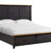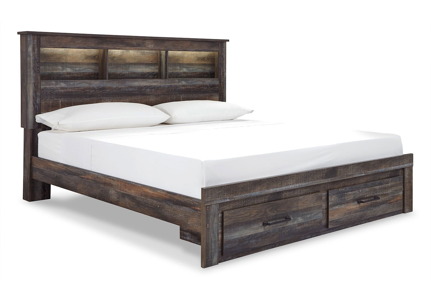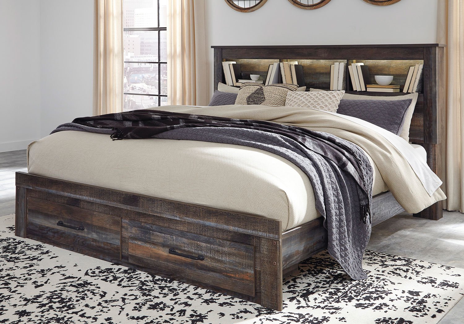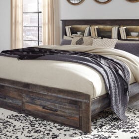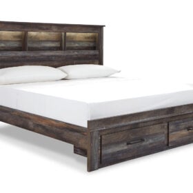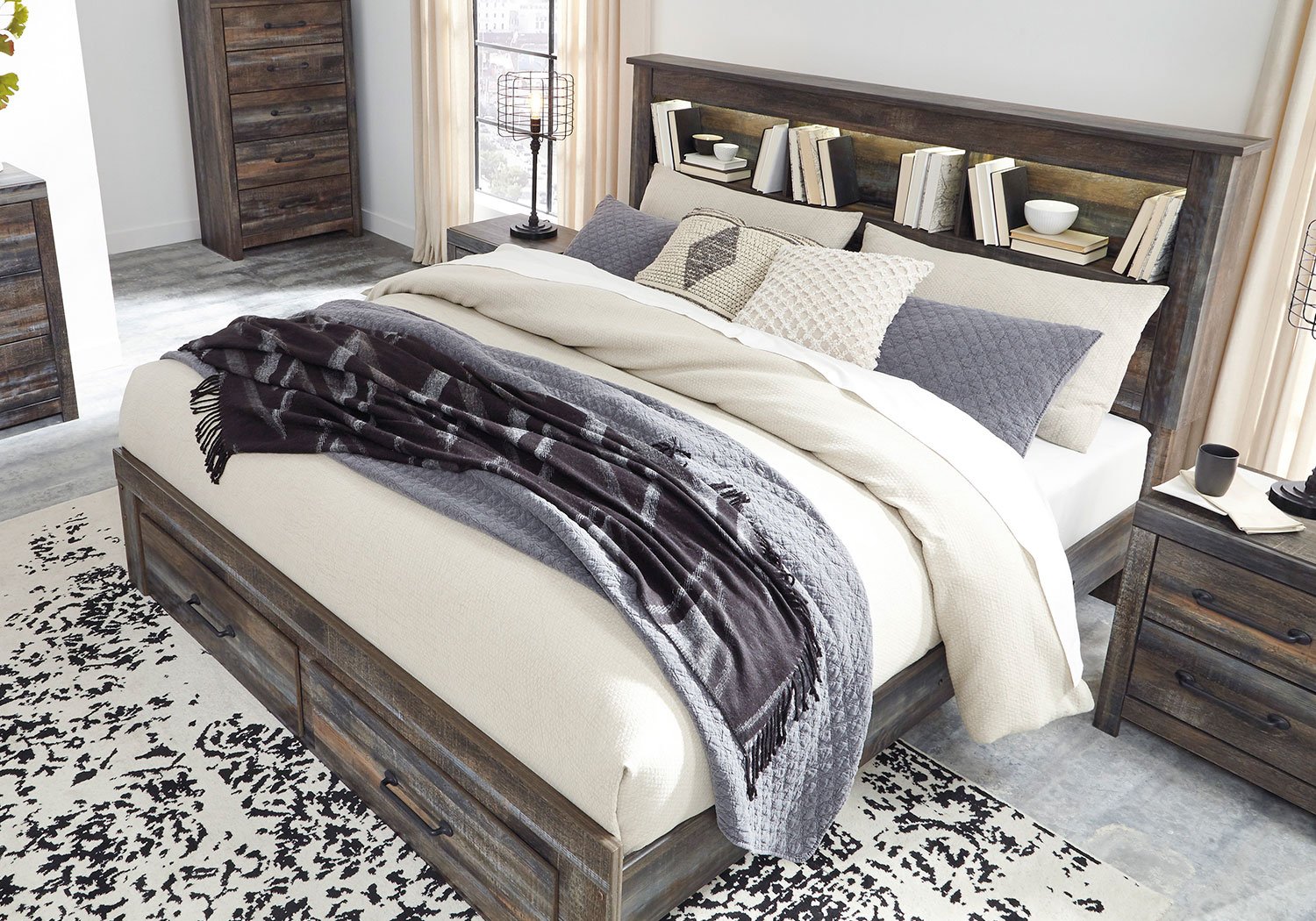 When merged in just the right way, rustic and industrial styles can make one happy marriage. Case in point: this king bookcase bed. A refined take on barn board beauty, its complex, replicated wood grain showcases hints of burnt orange and teal tones for a sense of weatherworn authenticity. Three open cubbies lined with a dimming LED light strip keep bedtime reads top of mind.