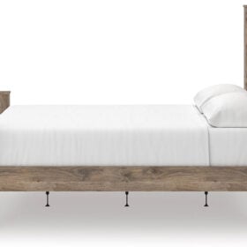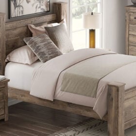 Made with engineered wood (MDF/particleboard/plywood) and decorative laminate for the right balance of affordability and durability. Deep brown finish over replicated hickory grain with authentic touch. Decorative laminate replicates natural or man-made material surfaces with consistent color, pattern and texture. Foundation/box spring required.