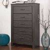 Styled to impress, the Brinxton King Bedroom Set is urban sophistication with a decidedly relaxed air. It’s got the crisp, clean lines of a contemporary piece, but with an earthy element. Replicated oak grain effect gives the chic charcoal finish warmth and character. Linear pulls are a sleek touch.