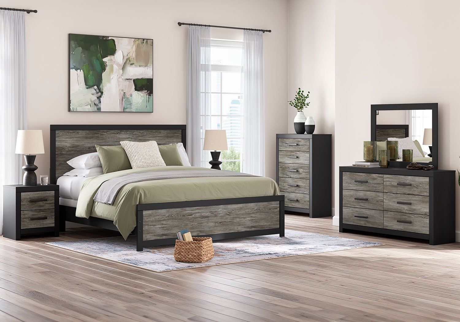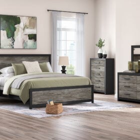 Made with engineered wood (MDF/particleboard/plywood) and decorative laminate for the right balance of affordability and durability. Two-tone finish (warm gray finish and matte black finish with replicated oak grain). Decorative laminate replicates natural or man-made material surfaces with consistent color, pattern and texture. Foundation/box spring required.