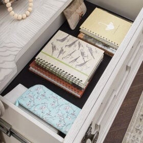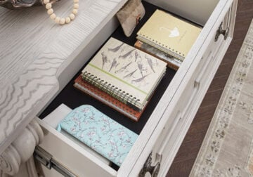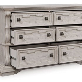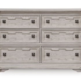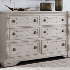 Made with hardwood solids, oak and ash swirl veneers, MDF substrates and cast resin components. Antiqued white finish. Hardware with antiqued bronze-tone finish. Case pieces having drawers with fully finished interiors, English dovetail construction and heavy-duty ball-bearing side glides (top drawers felt lined).
