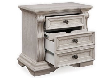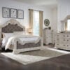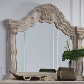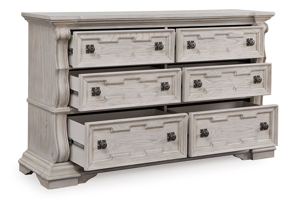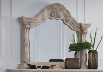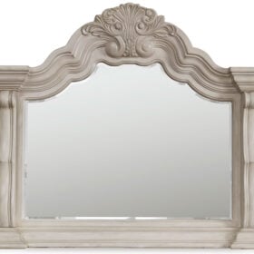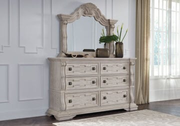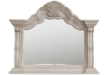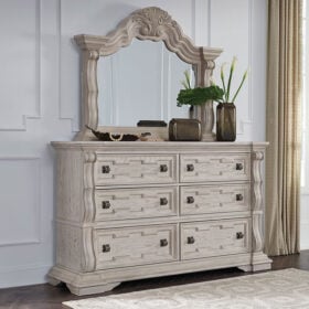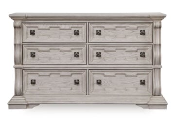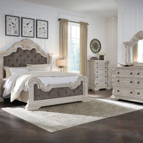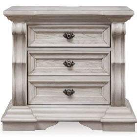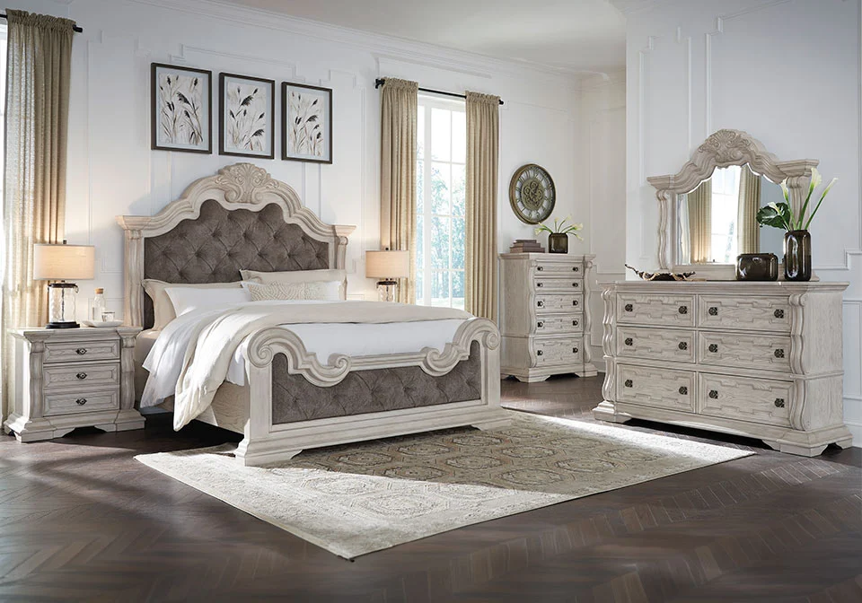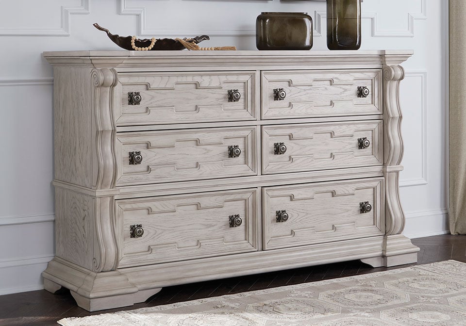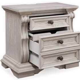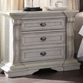 Inspired by the grandeur and grace of European traditional style, this opulent Series is nothing short of stunning. Its large-scale decorative scrolled pilasters, along with an ash swirl border and walnut inlay crowning the top, are sure to make a sophisticated statement in your restful retreat. A timeless antiqued white coloration and bronze-tone drawer pulls on case pieces lend an air of subtle elegance to this sumptuous piece.