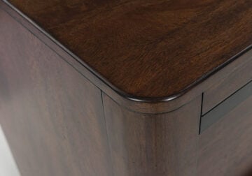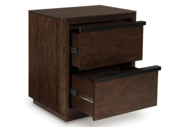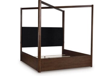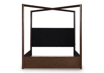 Casual contemporary styling with a decidedly modern vibe. Bathed in a rich dark brown finish, this king canopy bed is warm and inviting, while the integrated “X” canopy and full wrap-around rails set to the floor adorn your restful retreat with on-trend elegance. Dual USB charging on both sides of the upholstered headboard is a subtly cool way to keep your electronics at the ready. What a simply stunning way to achieve the bedroom of your dreams.