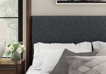 Made with hardwood solids, mango wood veneer and MDF substrates. Side rails feature laminated solid hardwood slat support rails (or LVL) with glued and screwed blocking for added strength. Complex, rich dark brown finish. Foam headboard cushion with polyester upholstery. Measure room, including ceiling height, to ensure bed clears fans and light fixtures. Foam cushion with polyester upholstery. Foundation/box spring required. USB-A and USB-C charging ports. Assembly required.