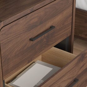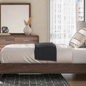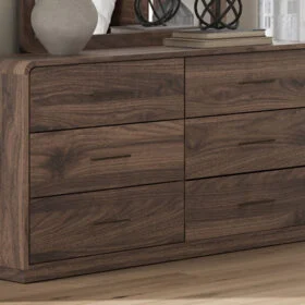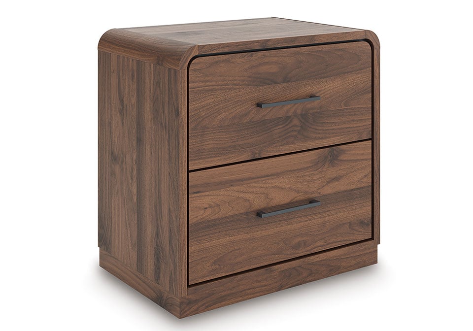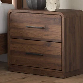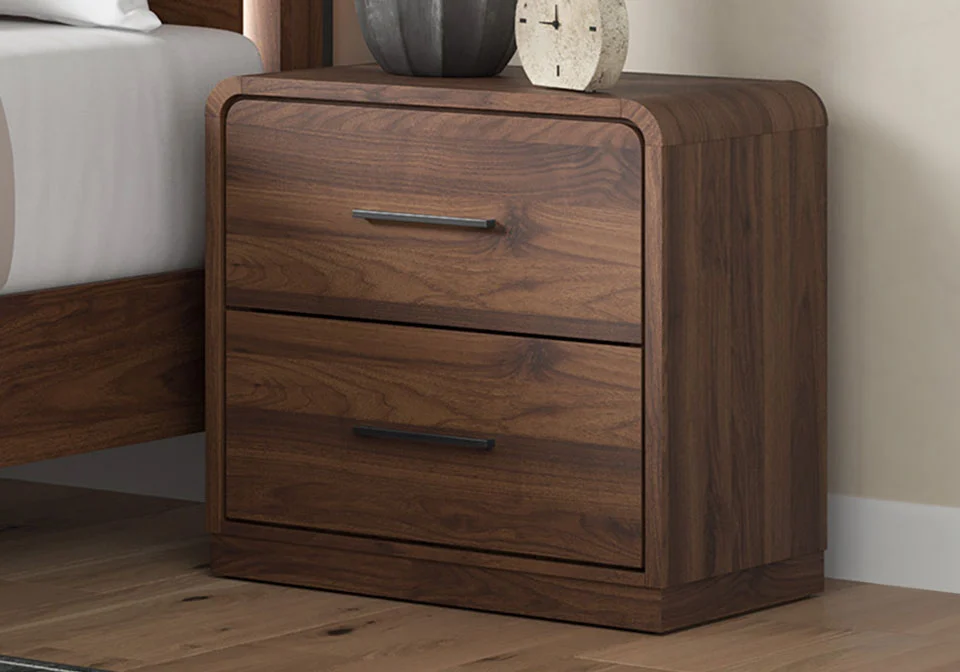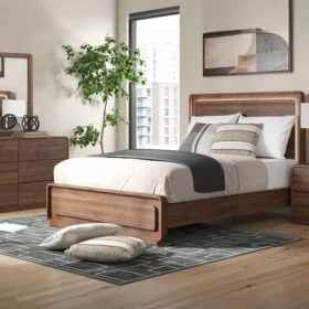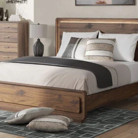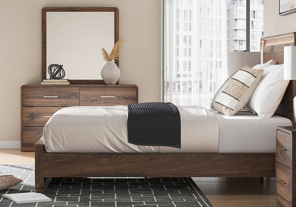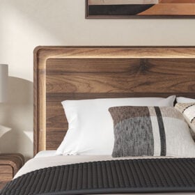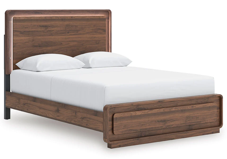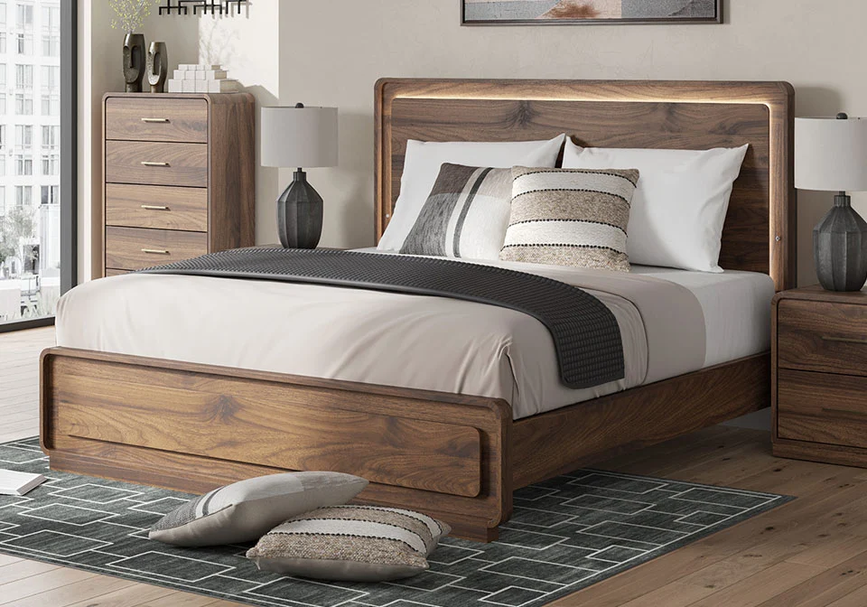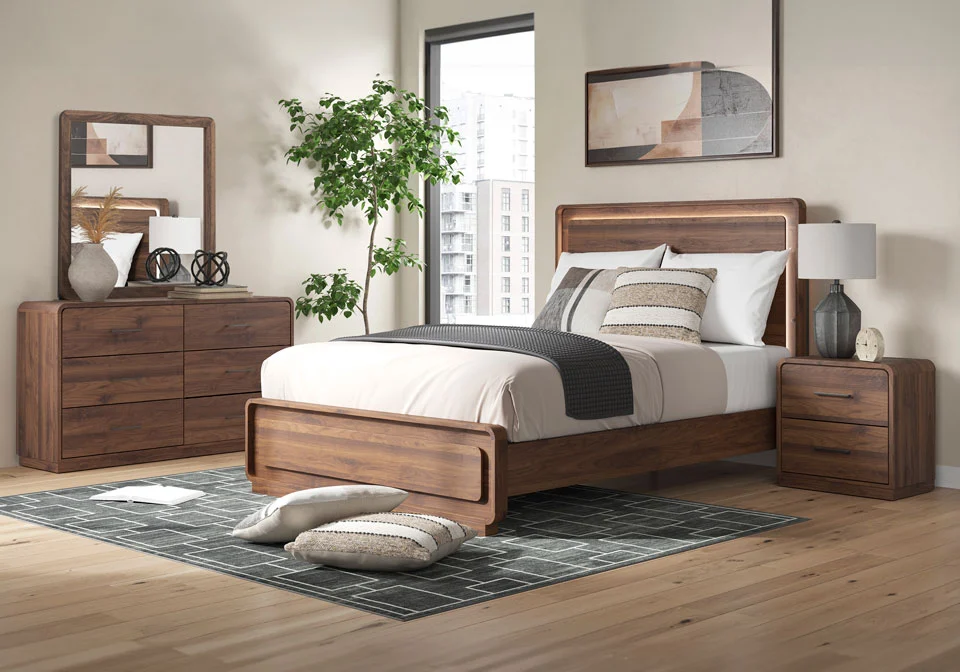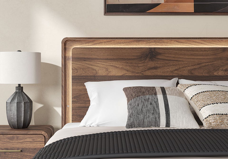 Grace your restful retreat with an added dose of refinement. This Panel Series showcases a stunning rich brown wood tone, Case pieces with sleek drawer pulls for an added layer of luxury, while the rounded frame softens its silhouette to elevate the look. And it seamlessly incorporates forward-thinking function, with an LED backlight in the headboard that can be easily accessed from both sides. It’s curated, contemporary and utterly chic.