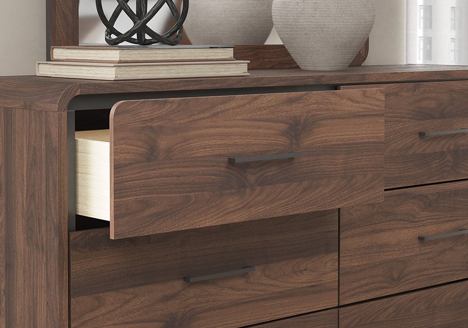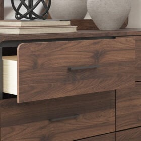 Made with MDF substrates and decorative paper laminate. Replicated walnut wood grain with high-low contrast for a rich brown wood tone. LED backlight feature with 3-way dimmer switch; operates from both sides of the bed. Case pieces with smooth-gliding drawers with English dovetail construction and center mount drawer guides. Drawer interiors lined with decorative wood grain paper laminate. Bed does not require additional foundation/box spring; accommodates most zero clearance adjustable bases.