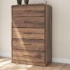 Made with MDF substrates and decorative paper laminate. Replicated walnut wood grain with high-low contrast for a rich brown wood tone. LED backlight feature with 3-way dimmer switch; operates from both sides of the bed. Case pieces with smooth-gliding drawers with English dovetail construction and center mount drawer guides. Drawer interiors lined with decorative wood grain paper laminate. Bed does not require additional foundation/box spring; accommodates most zero clearance adjustable bases.