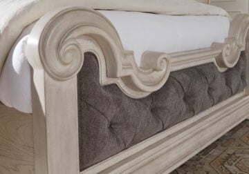 Inspired by the grandeur and grace of European traditional style, this opulent Series is nothing short of stunning. Its large-scale decorative scrolled pilasters, along with an ash swirl border and walnut inlay crowning the top, are sure to make a sophisticated statement in your restful retreat. A timeless antiqued white coloration and bronze-tone drawer pulls on case pieces lend an air of subtle elegance to this sumptuous piece.