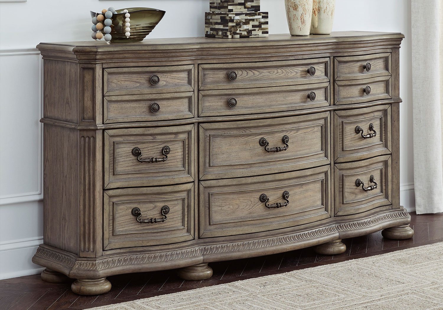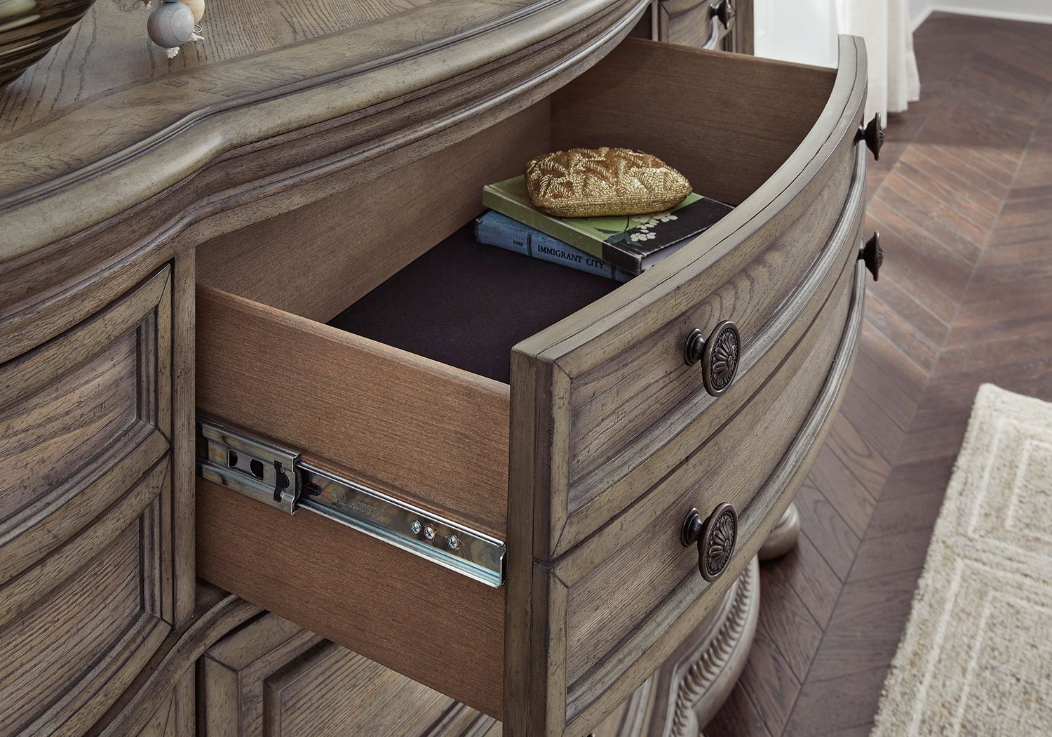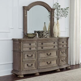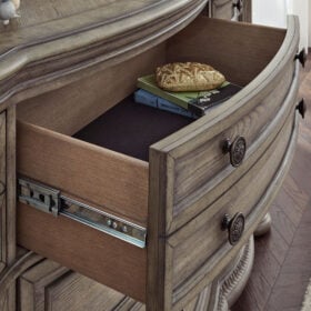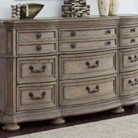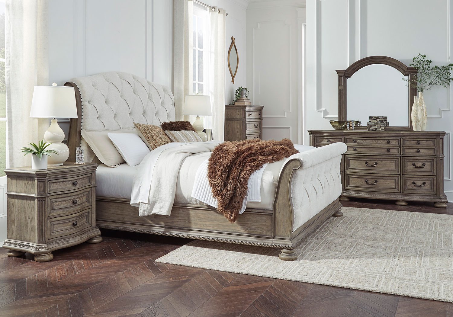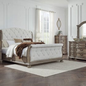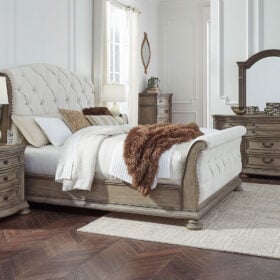 Merging traditional elegance with modern comfort, this upholstered sleigh Series takes your bedroom retreat to the next level. It radiates timeless sophistication with its shapely curves, glazed antiqued-look finish and tufted cushions. Talk about stunning refinement.