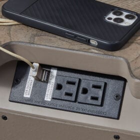 Made with solid wood frames, solid wood blocking and foam. Light brown finish with glazed antiqued look. Polyester upholstery. Nailhead trim with aged bronze-tone finish. Foundation/box spring required.