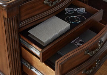 Made with hardwood solids, cherry veneer with MDF substrates, decorative cast resin and furniture grade plastic components. Cherry brown finish. Headboard with metallic accent filigree. Foundation/box spring required.