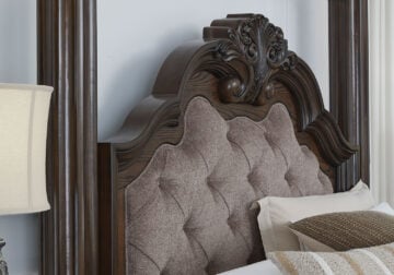 Made with hardwood solids, oak and ash swirl veneers, MDF substrates and cast resin components. Dark brown finish. Polyester upholstery with button tufting. Foundation/box spring required. Case good pieces with smooth-gliding drawers & dovetail construction (top drawer felt lined).