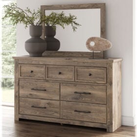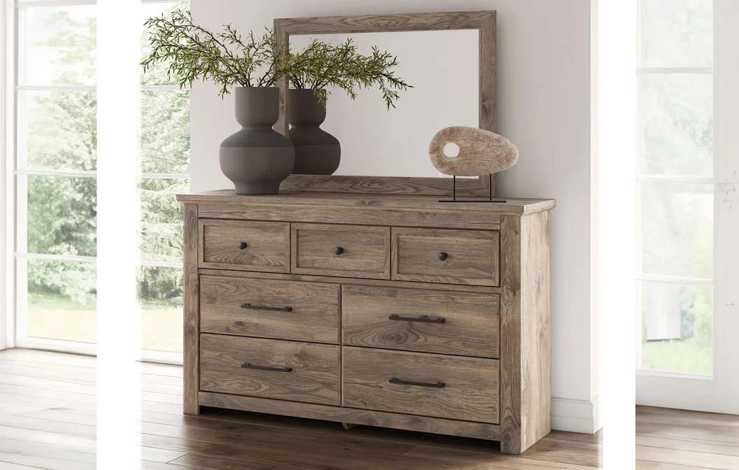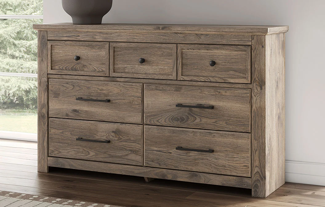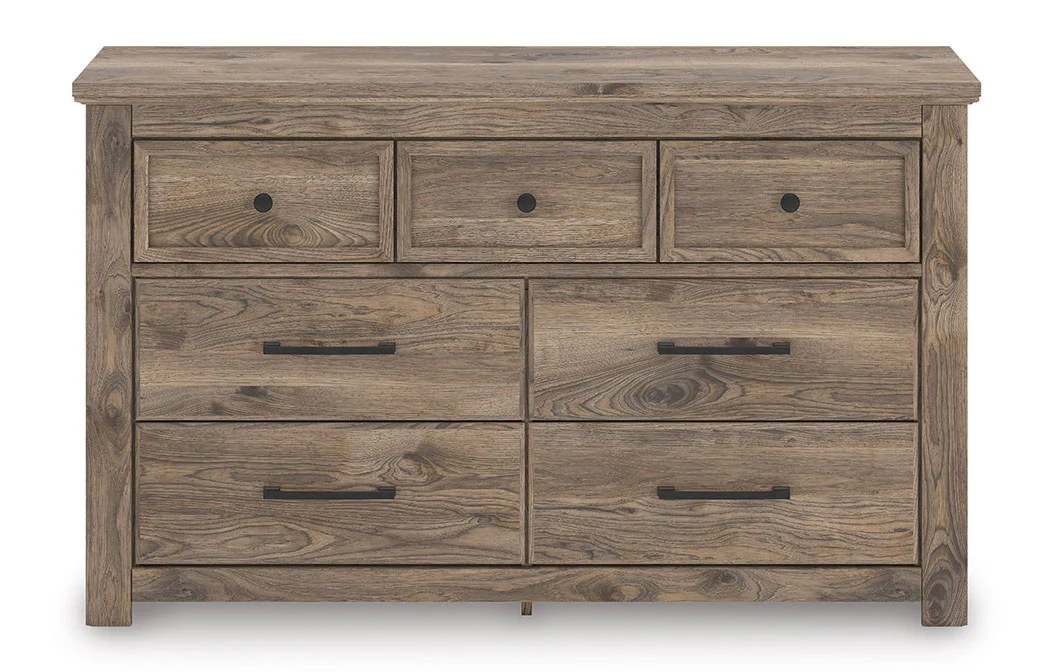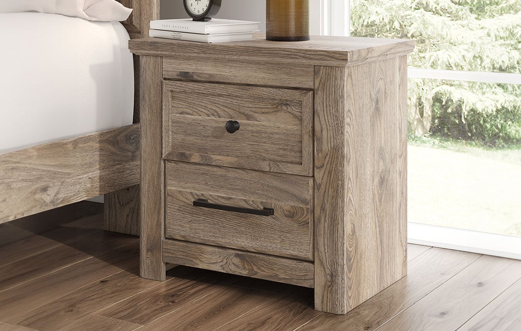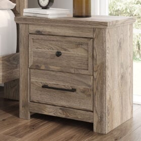 Made with engineered wood (MDF/particleboard/plywood) and decorative laminate for the right balance of affordability and durability. Deep brown finish over replicated hickory grain with authentic touch. Decorative laminate replicates natural or man-made material surfaces with consistent color, pattern and texture. Foundation/box spring required.