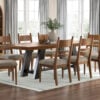 Base made with hardwood solids, veneer and MDF substrate. Table top made with hardwood solids, mango wood veneer and MDF substrate. Two-tone finish (mindi wood veneer inlay top with medium brown finish; base with painted black finish). Table extends by pulling both ends and dropping in leaf. Heavy-duty ball-bearing equalizing table glide system. Extends smoothly thanks to easy-glide technology. Seats up to 10. Chairs with Polyester upholstery & Foam cushioned seat which also Includes adjustable levelers
