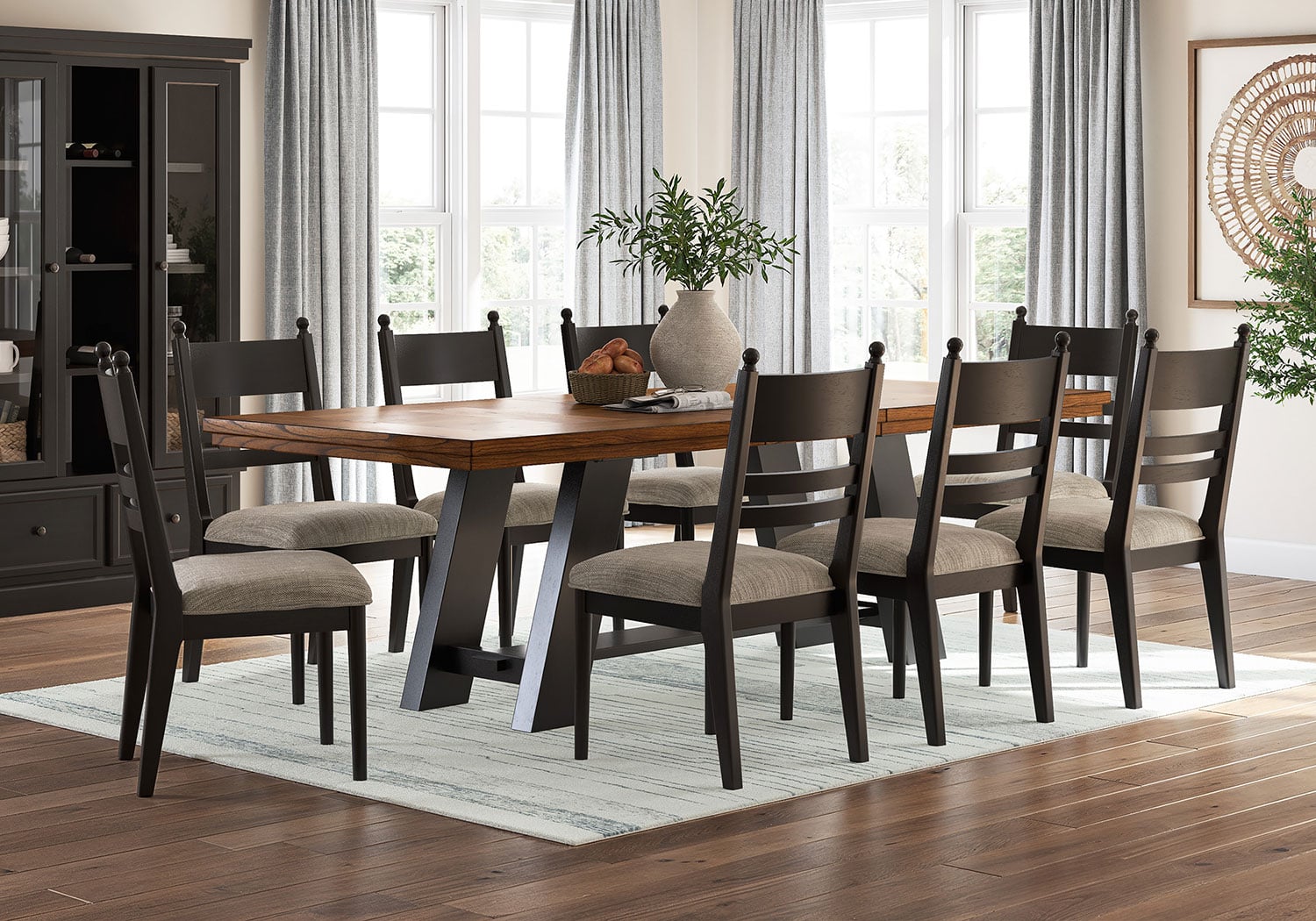 Base made with hardwood solids, veneer and MDF substrate. Table top made with hardwood solids, mango wood veneer and MDF substrate. Two-tone finish (mindi wood veneer inlay top with medium brown finish; base with painted black finish). Table extends by pulling both ends and dropping in leaf. Heavy-duty ball-bearing equalizing table glide system. Extends smoothly thanks to easy-glide technology. Seats up to 10. Chairs with Polyester upholstery & Foam cushioned seat which also Includes adjustable levelers