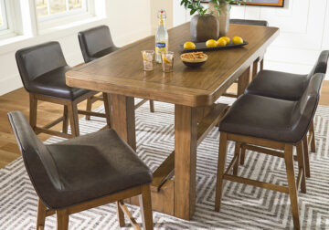 Define your dining space with reliable function and style. This counter height Series sits comfortably at the intersection of modern lodge and casual lifestyle aesthetics. Softly rounded corners keep kids safe and your dining area stylish. Charming architectural elements and a light brown glazed finish reflect your warm and welcoming disposition. Even with its poise, this Series remains practical.