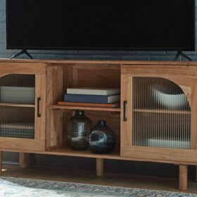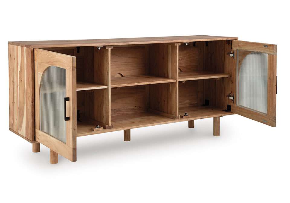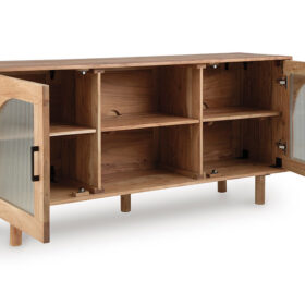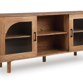 Simply chic storage awaits with this accent cabinet. With the versatility to act as a classic sideboard or a trendy TV stand, it’s at home in settings ranging from casual to modern. Doors with curved half-arch glass inserts soften the clean-lined look, while the removable shelves inside give you that much more flexibility. Openings in the back for electronics keep cables neatly organized, and the open middle shelving acts as a perfect host for media consoles.