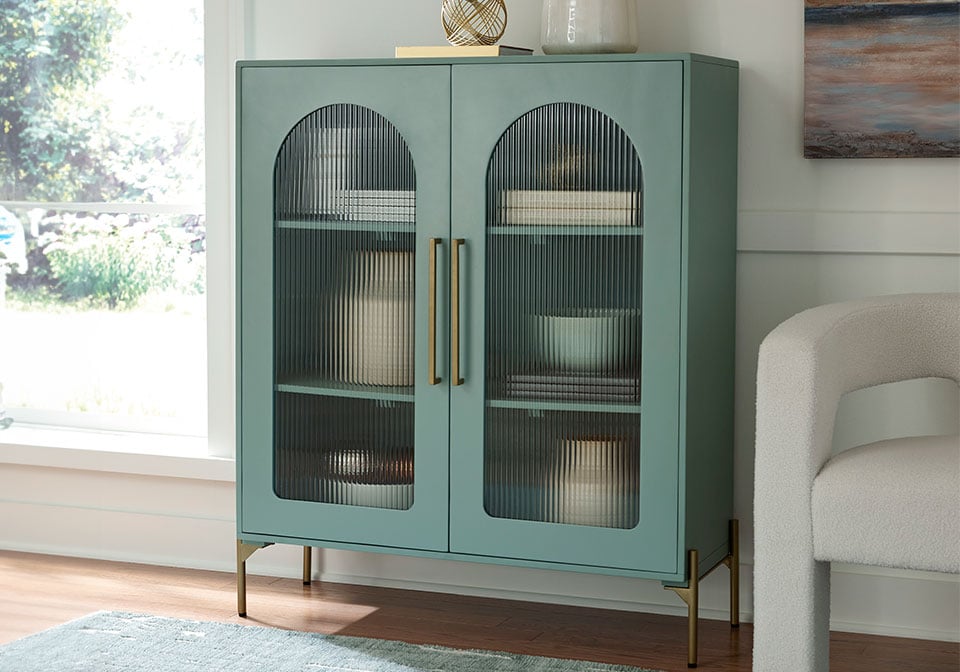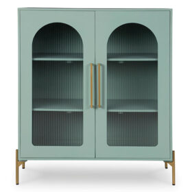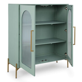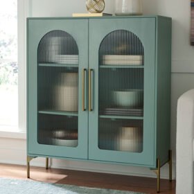 Clearly a stunning statement piece for lovers of contemporary design, this sleek accent cabinet wows on many levels. Magnificent arched fluted glass door panels and goldtone metal hardware exude serious modern flair. And how about that fresh green finish? Two shelves add practicality to the cabinet’s striking style.