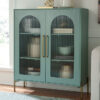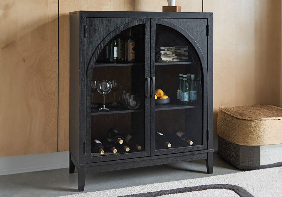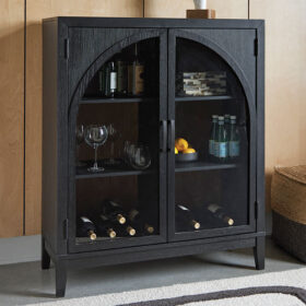 If your love of entertaining is only surpassed by your love of sleek, versatile style, this bar cabinet expertly suits your needs. Racks for wine bottles and glasses neatly store necessities for a pour of vino. Adjustable shelves comfortably hold additional bottles, dishware or drink-making accessories. For added flexibility, the cabinet’s black and natural brown finishes effortlessly pair with your home’s existing aesthetic. Doors with softly curved glass inserts allow this chic piece to double as a display space.